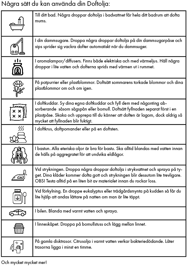 Skillnaden på eterisk olja och parfymolja? Eteriska oljor är tagna direkt från växtriket, som till exempel i Lavendel där vi tagit lavendelblomman och genom destillering fått fram en ren och naturlig eterisk olja. Eller som i Citrongräs, där man genom kallpressning fått fram ren och naturlig citrusolja. Eterisk olja kan användas till aromaterapi. Lavendel till exempel är lugnande, och citrus är uppiggande. Det går åt väldigt mycket växtdelar att göra eterisk olja. Till vår lilla flaska Lavendelolja krävs det hela 1,3 kg lavendelblommor! Så doften blir också fantastisk. Oljan användas ofta i mat och godis och i parfymer, och som hos oss, i doftljus och doftpinnar! Våra parfymoljor är en blandning av en massa olika ingredienser, inklusive eteriska oljor, som tillsammans skapar en doft som återspeglar någonting. Som till exempel i Bubbel & Rosa Grapefrukt. Det är mycket svårt att destillera champagne och få ut koncentrerad bubbel-doft. Därför blandar vi istället, ibland 100-tals dofter, som tillsammans ger en känsla av Bubbel och lyx. Använd aldrig doftoljan direkt på huden. Den må vara framtagen för hudvård men aldrig i ren form, utan måste späs.